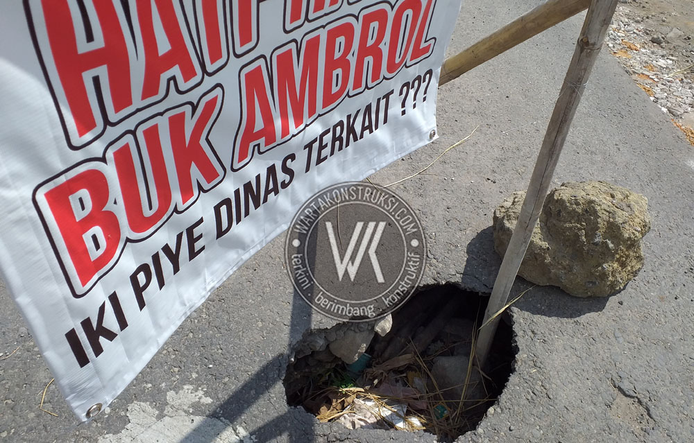 Di lokasi hanya memberi tanda di ruas jalan yang ambrol agar tidak memakan korban. Dari pantauan media ini di lokasi, terlihat konstruksi sederhana dari bambu ditopang bamboo lain dan ditahan dengan batu yang sengaja dipasang warga di lokasi. Di bagian tengahnya dipasangi banner bertuliskan ‘Hati-hati! Buk Ambrol. Iki Piye Dinas Terkait???.